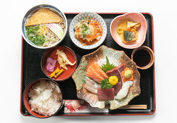 法事の懐石(品数7品ほど)刺身、煮魚、酢の物、天ぷら、寿司、茶碗蒸し、フルーツ等4000円〜